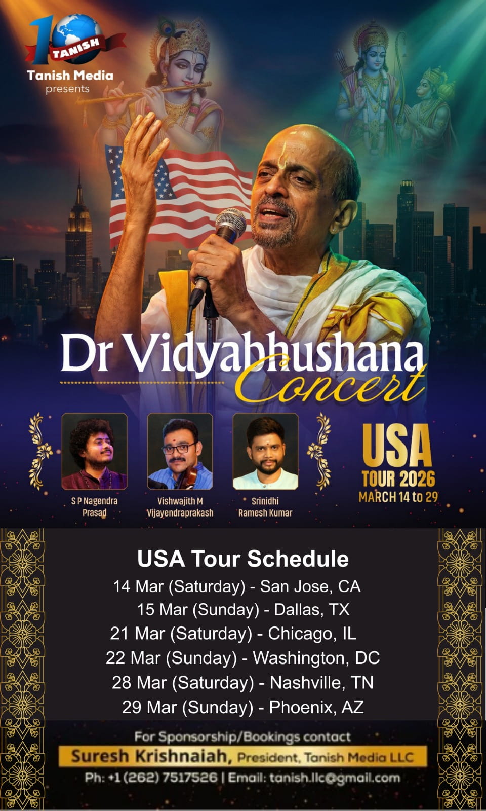 Tanish Media partnered with multiple talented artists from India and provided entertainment in USA and North America.We have a lineup of worldclass talent who performed under the banner of Tanish Media starting with Pranayaraja Srinath USA tour, Manjula Gururaj, Badri, VijayPrakash and team, Dr Vidyabhushana, Anoop Seelein, Anuradha Bhat, Ankita Kundu along with talented musicians like drummer Arun Kumar, Brutva Caleb and musicians from Music Mansion – Sandeep Vasishta, Ranjan Beura, Pradyumna Soraba, Venugopal, Abhishek, Shadrack Solomon and Sitar Symphony – Suma Rani, Shruthi Kamath, Srinivasan, Kishore Lingappa, Hamsini and others.